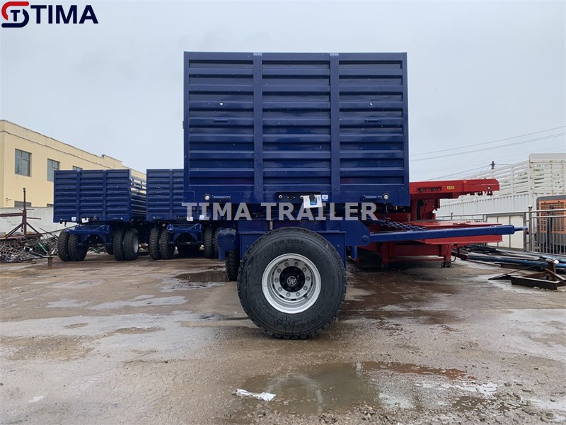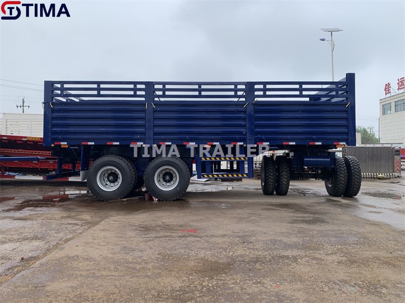 A altura da parede lateral do reboque da cerca da barra de tração é de 800 + 100 + 300 mm, a espessura da parede lateral é de 2 mm, o material é aço de alta resistência . É muito adequado para transporte de carga a granel. O eixo é da marca BPW, o pneu é da marca TRIANGLE, as peças de reposição podem ser obtidas facilmente no local.